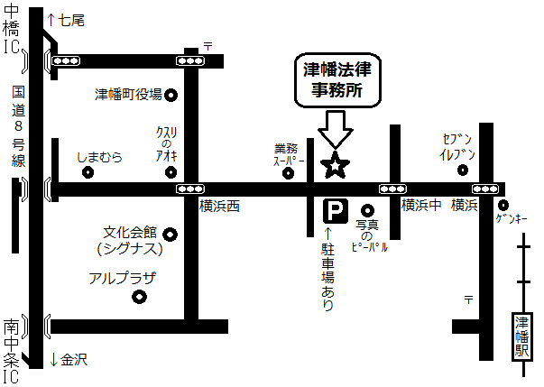 津幡町営バス のバス停「横浜西」を降りて、徒歩3分。